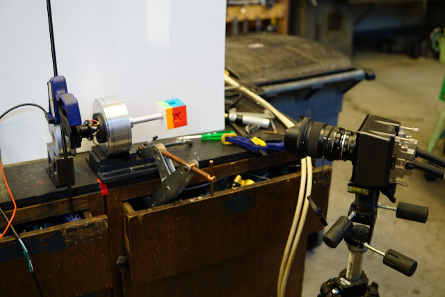We tested with an actual cube, using Bayley's Photron for high-speed recording. The "speed cubes" we used have pop-off caps at the center of each face. Beneath the cap is a screw you can use to adjust the amount of slop in the cube. We machined some square-drives that press into the recess beneath the cap, so no cube modification was required.
